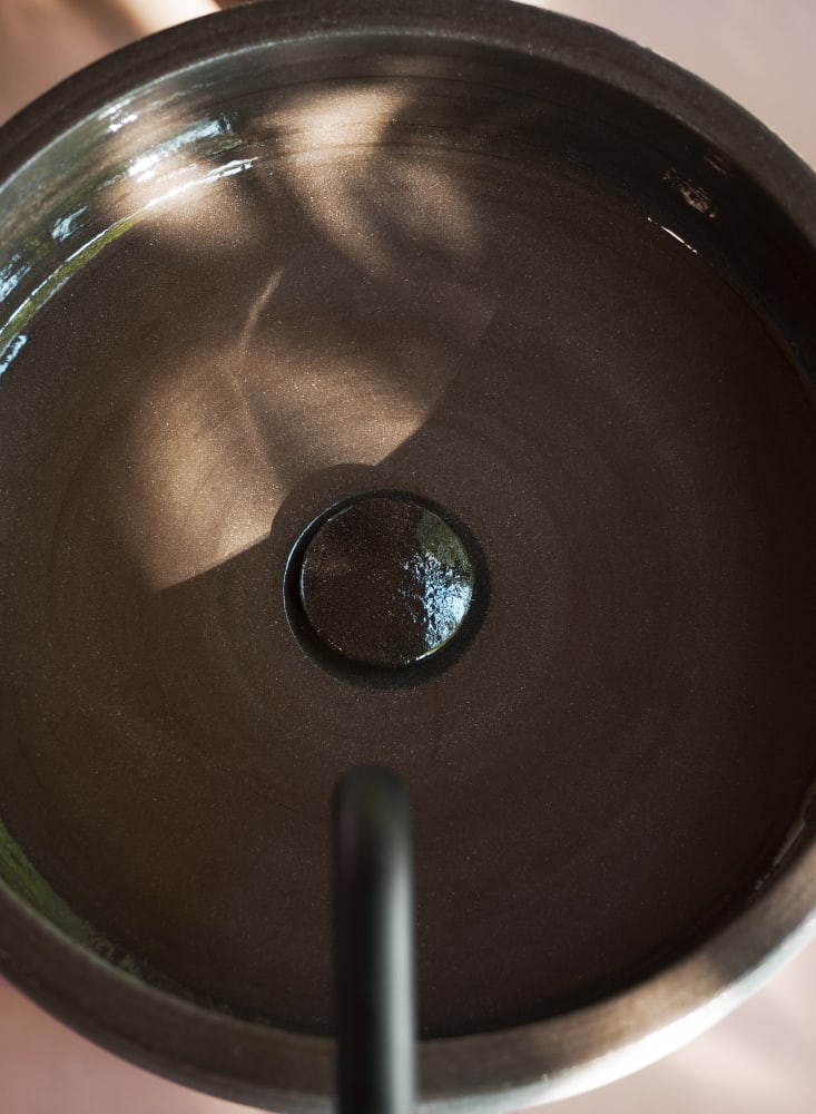 Runder Aufsatzwaschtisch aus Ton, ohne Hahnloch und mit freiem Ablauf. Die äußere Oberfläche ist in dunkler Erde erhältlich, mit einer glasierten Innenseite. Die Innenglasur ist transparent. Ein Ablaufventil ist hier noch nicht enthalten und müsste extra erworben werden.