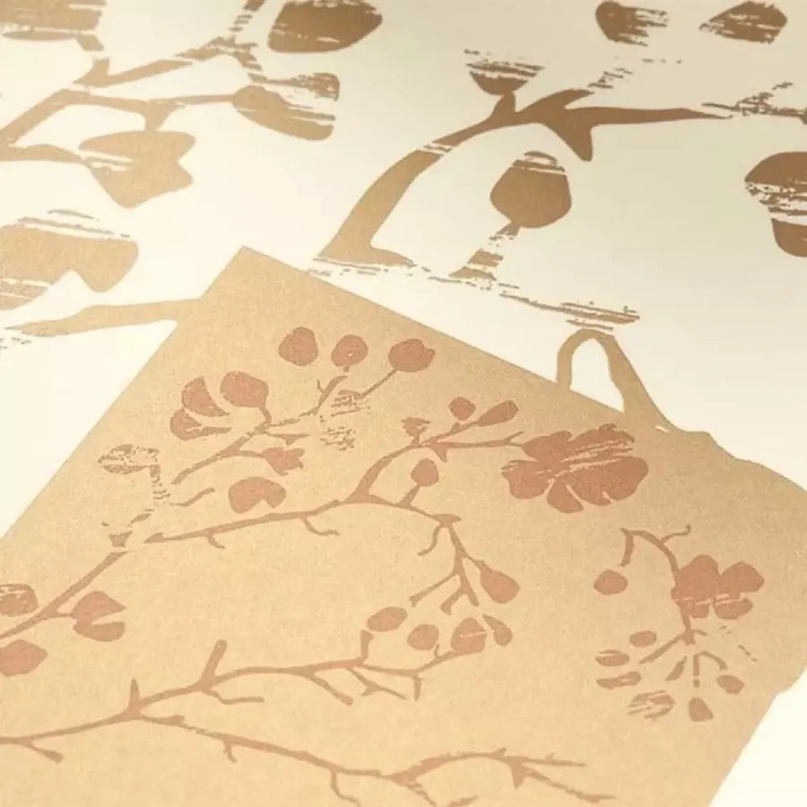 Klappkarte mit Kirschblüten, die das ganze Jahr blühen, im modernen quadratischen Format. Die Grußkarte ist von Hand im Siebdruckverfahren in Gold und Kupfer bedruckt. Passender Umschlag mit Seidenfutter.
