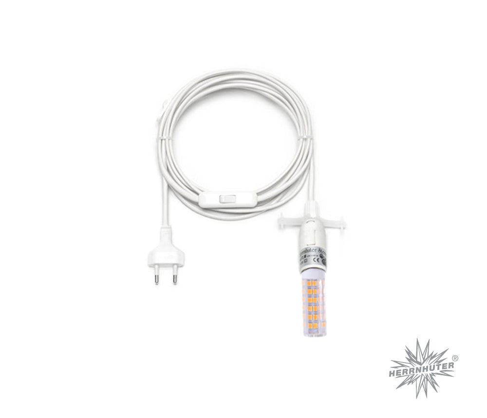 Das weiße Innenkabel ist zum Beleuchten der Herrnhuter Papiersterne I4-I8 ( 40 - 80 cm Durchmesser) geeignet. Das Kabel mit Zwischenschalter hat eine Gesamtlänge von 4 Meter und ist mit einer LED ausgestattet. Der Stecker hat die EU-Norm, für die Schweiz und Großbritannien ist ein entsprechender Stecker auf Wunsch lieferbar.