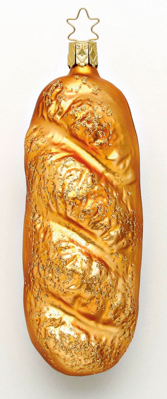 Das Handgefertigte Baguette der Inge Glas-Manufaktur, schimmert golden und ist mit goldenem Glitzer verziert.