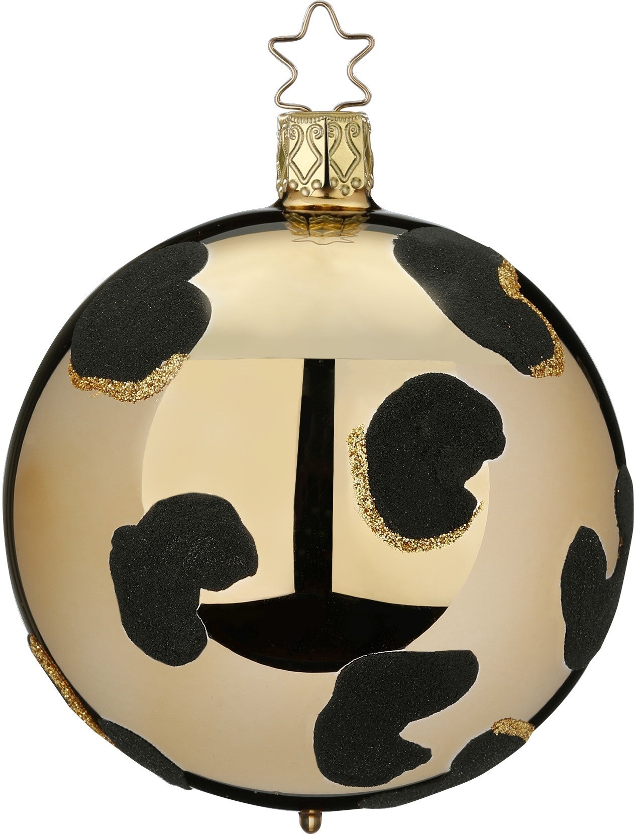 Die Christbaumkugel mit Gold-schwarzem Leoparden Muster und golden glitzernden Details ist handgefertigt.