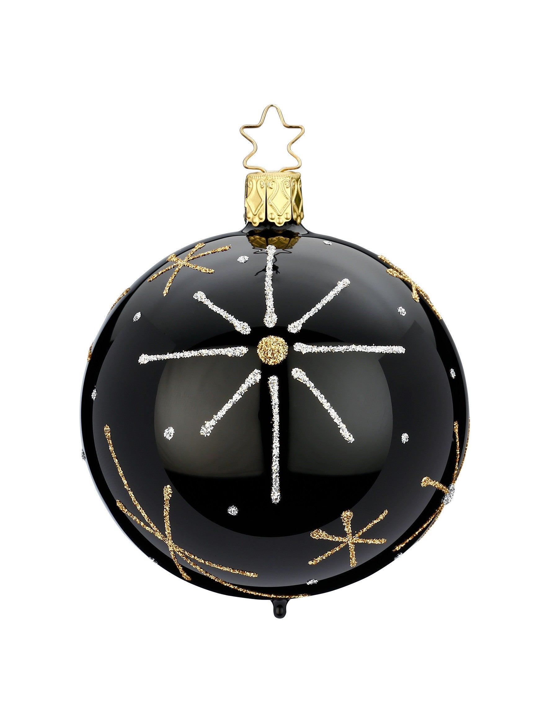 Die schwarz glänzende Christbaumkugel mit glitzernden Sternen und Verzierungen, in Gold und Silber, ist handgefertigt.