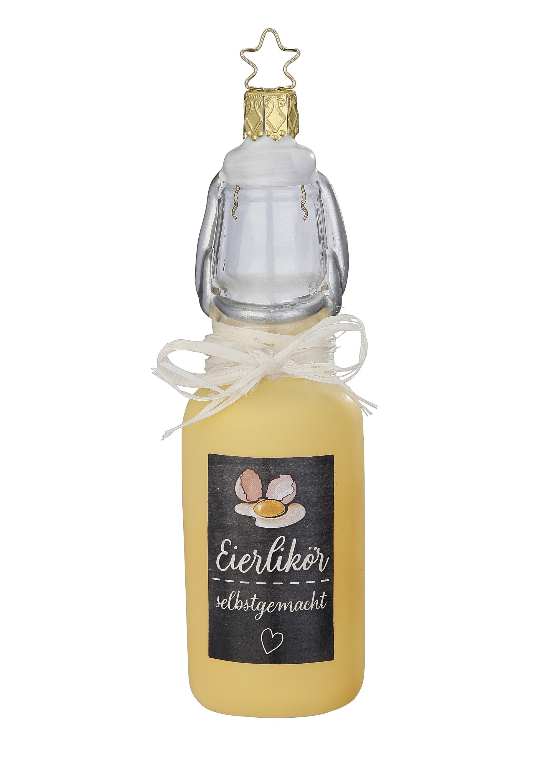 Das Eierlikörfläschchen der Inge Glas -Manufaktur, mit dekorativer Schleife und Etikett, ist Handgefertigt.