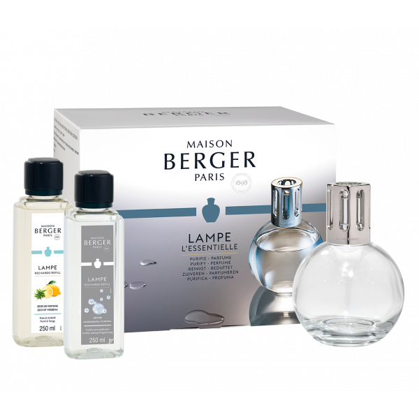 Das ideale Geschenkset - neue Ausführung Herbst 2019 - bestehend aus einem runden Glasflakon, katalytischem Brenner, Einfülltrichter, Löschkappe und jeweils 250ml neutrale Essenz und Zeste Verveine. Der transparente Glasflakon mit neuer, hochwertiger Krone hat eine Höhe von 15,5cm und ein Volumen von 360ml.