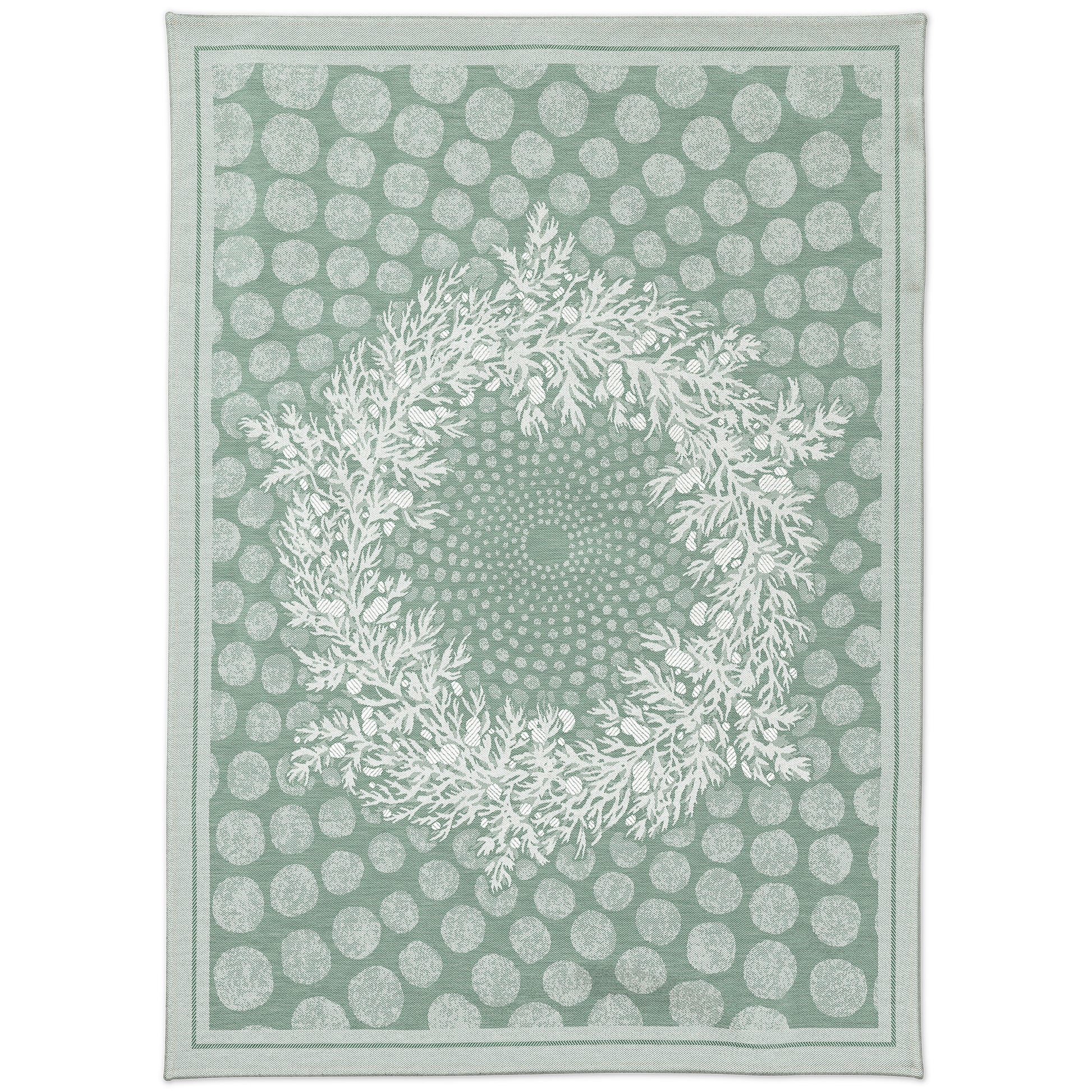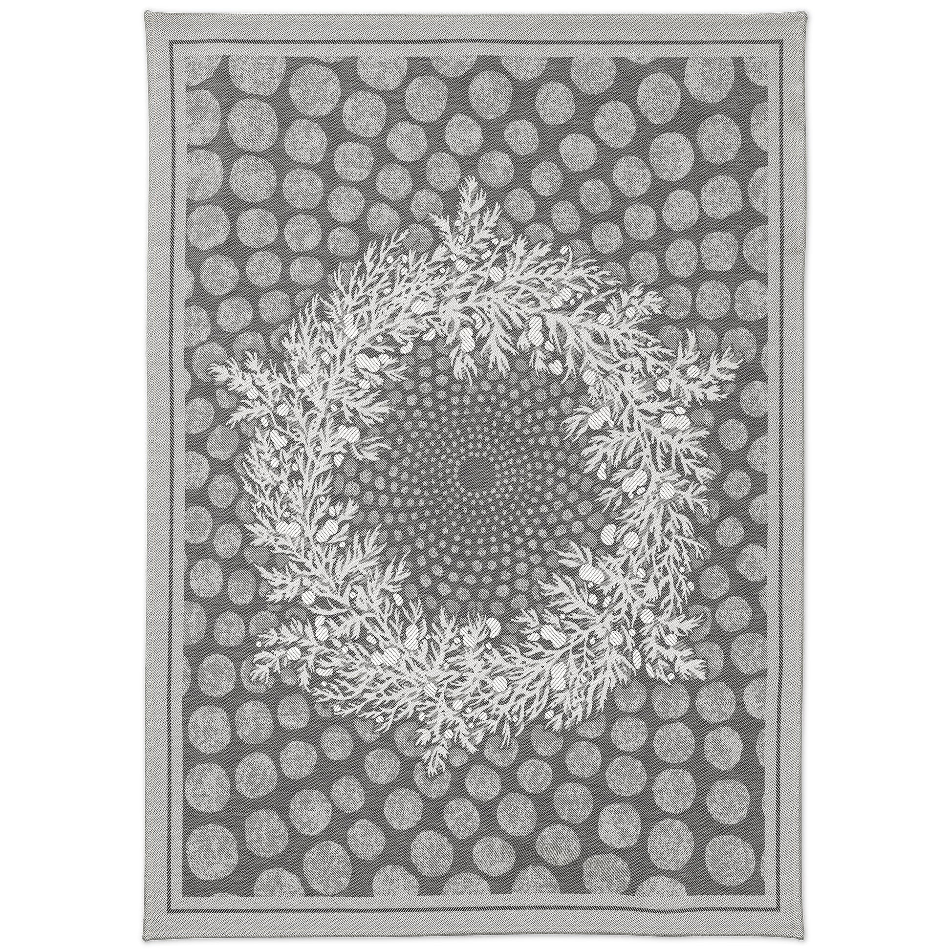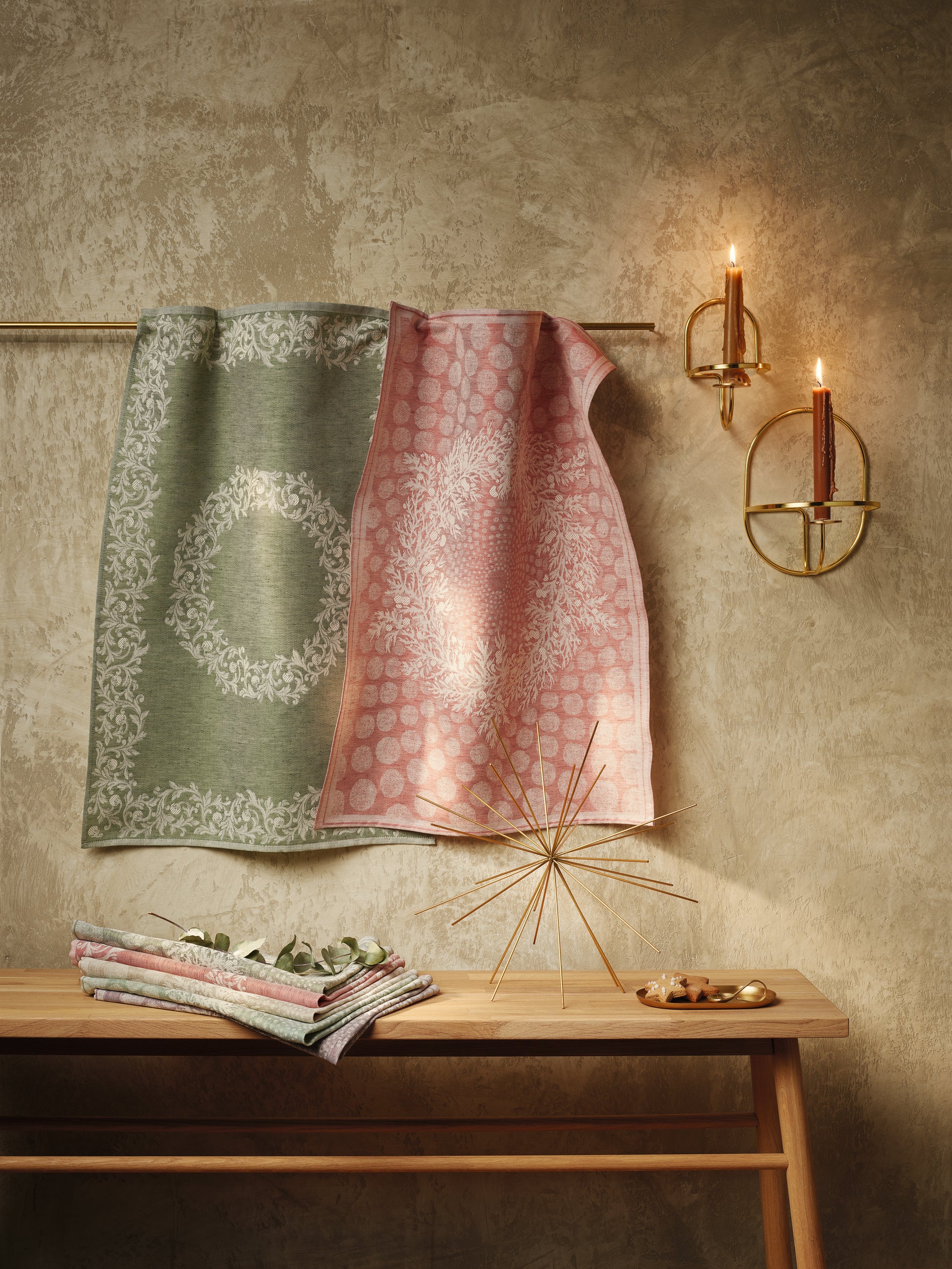 Ein Kranz mit festlichen Ornamenten ziert dieses Halbleinen Küchentuch. Ein dekorativer und zugleich praktischer Helfer im Küchenalltag.