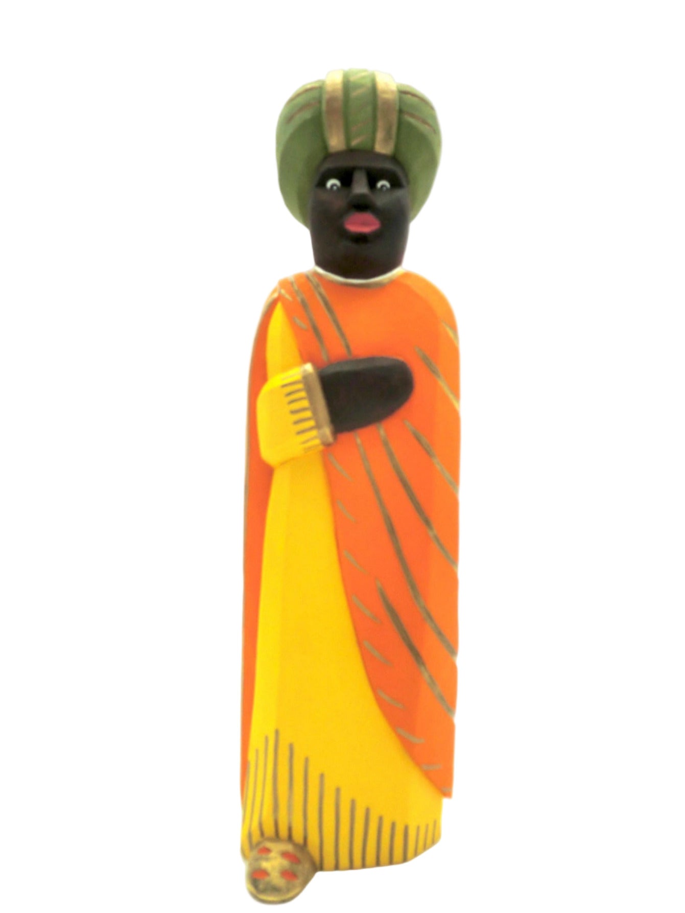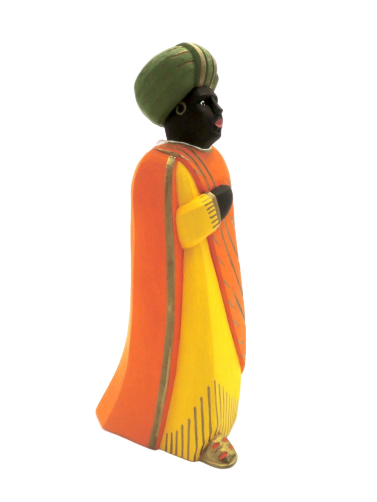 Der Fürst trägt ein leuchtend orange-gelbes Gewand, das kunstvoll drapiert ist und durch seine Farbintensität besonders ins Auge fällt. Der grüne Turban auf dem Kopf verleiht der Figur eine orientalische Würde und verweist auf ihre Rolle als Begleiter der Heiligen Drei Könige oder als eigenständiger Würdenträger in der erweiterten Krippenszene.