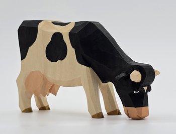 Die handgeschnitzte Kuh aus Lindenholz misst ca. 6,5 cm und zeigt eine fressende Pose mit schwarz gefleckter Bemalung aus hochwertigen Ölfarben. Dieses kunstvolle Holzschnitzwerk der Werkstatt Lotte-Sievers-Hahn ist perfekt auf die 12 cm Figuren abgestimmt und bereichert jede Sammlung traditioneller Holzfiguren durch seine detailgetreue Gestaltung.
