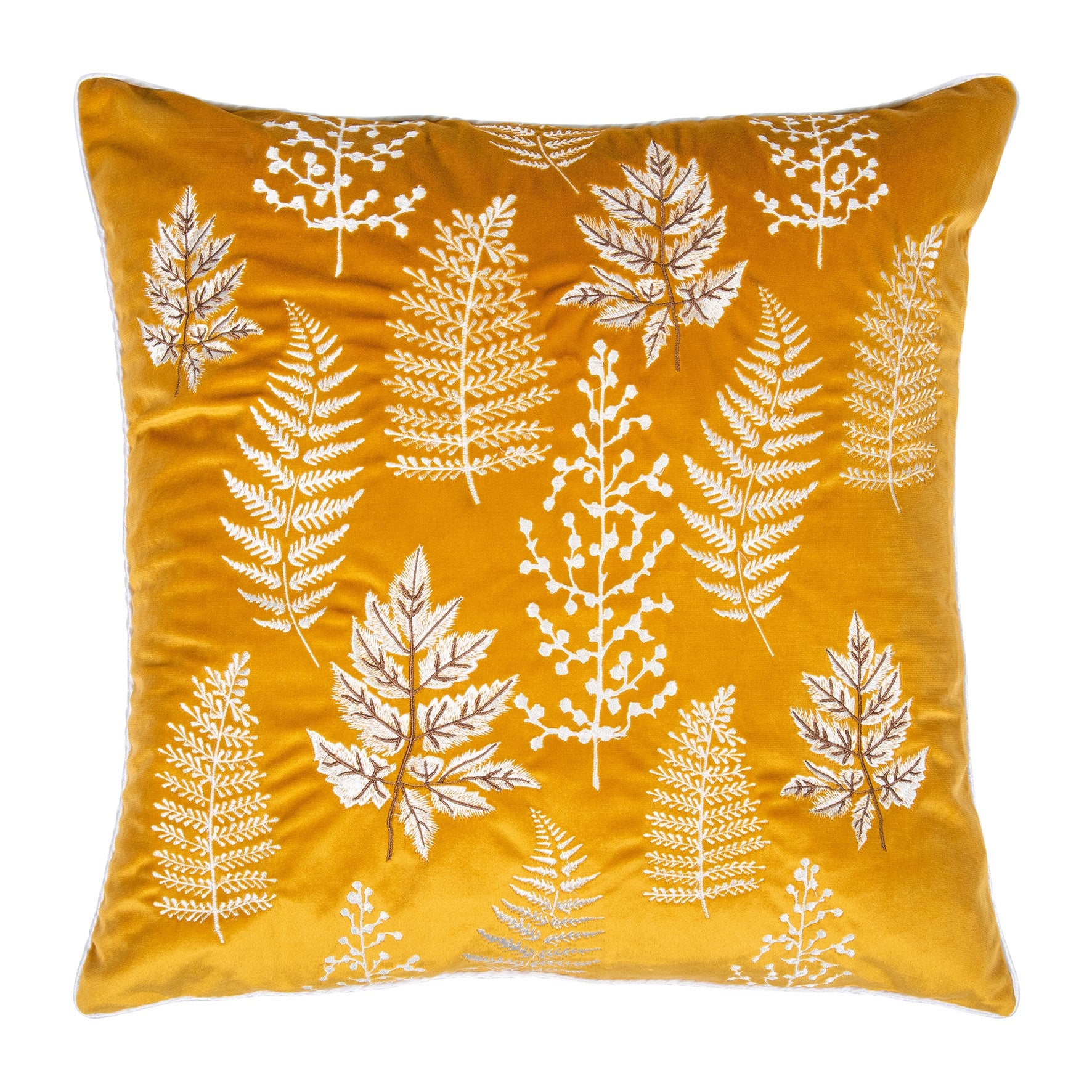 Die Kissenhülle "Yuletide" wurde mit weißen Blättern bestickt. Der Ockerfarbene Hintergrund wurde mit einem weißem Saum verziert, der das Kissen noch edler wirken lässt. Die Kissenhülle eignet sich perfekt als Dekoration für die Festtage. Die Rückseite des Kissens ist Unifarben und der verdeckt eingenähte Reißverschluss befindet sich an der Unterseite des Kissens.