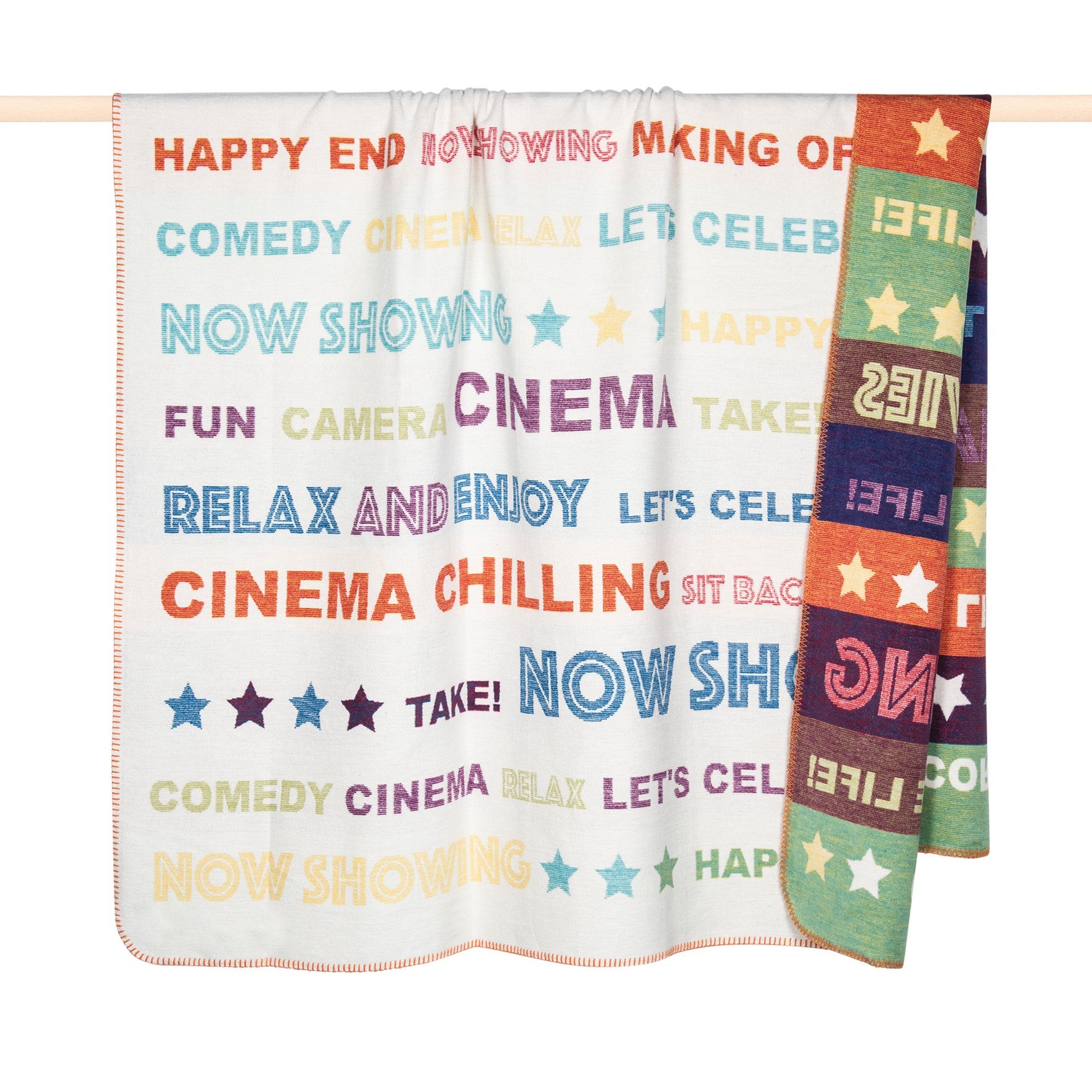 Das Wendeplaid " Celebrate" mit bunten Schriftzügen, besteht aus einer pflegeleichten Baumwollmischung.