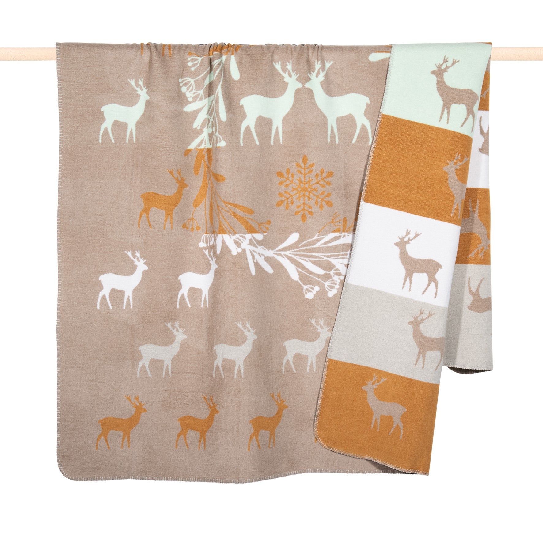 Das Wendeplaid "Reindeer“ besteht aus verschiedenen schlichten Farben wie beige und ocker, welche auf dem Plaid durch Motive von Rehen und Zweigen zur Geltung gebracht werden. Das Plaid besteht aus einer pflegeleichten Baumwollmischung.