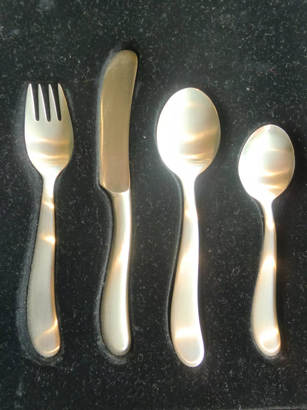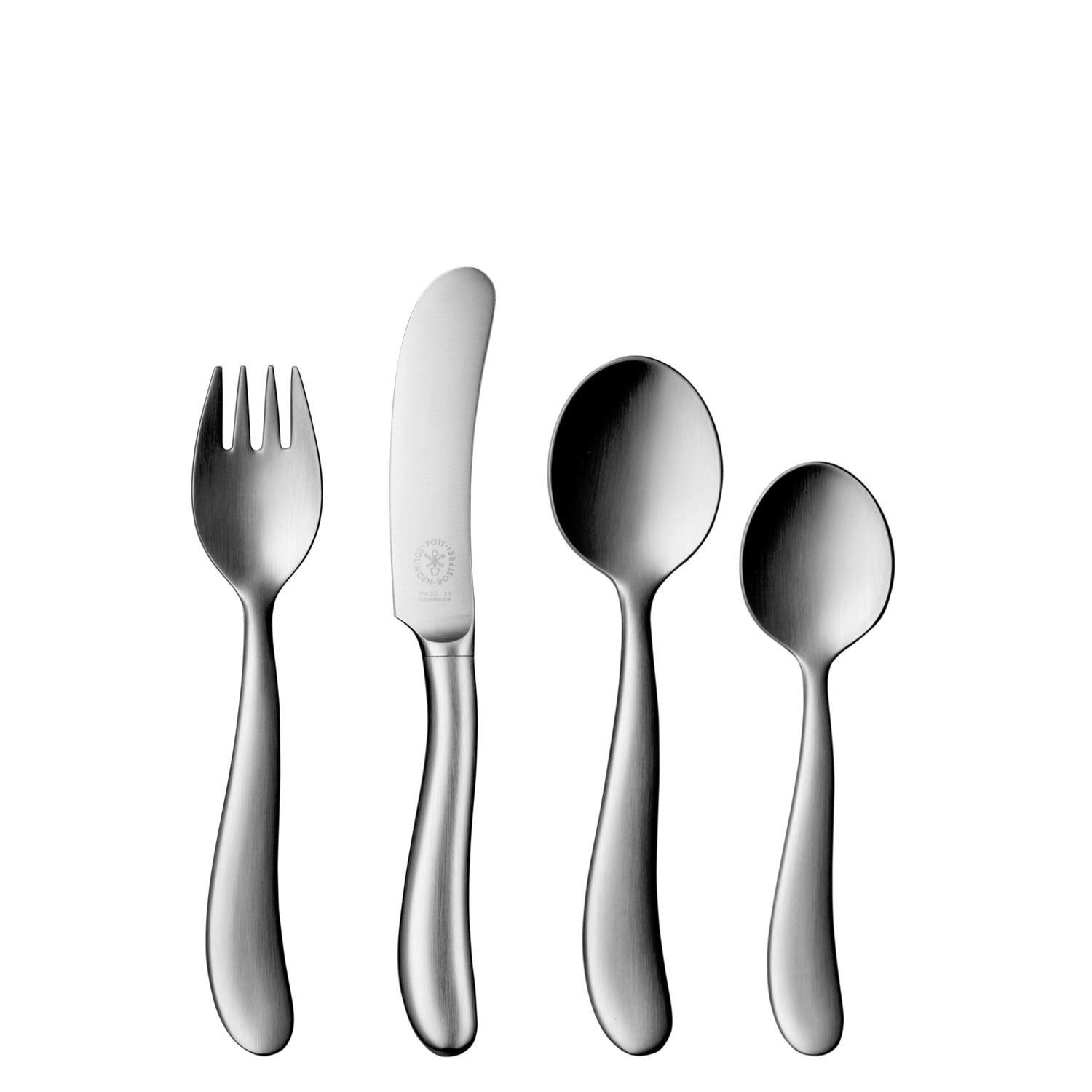 Das 4-teilige Kinderbesteck Bonito besticht durch seine schlichte Eleganz. Gefertigt aus Edelstahl 18/10, matt gebürstet und durch die leicht geschwungenen Griffe wirkt es elegant und zeitlos. Das Set umfasst je ein Messer, Gabel, Löffel und kleiner Löffel. Länge Messer 16,5 cm, Länge Gabel 14,5 cm, Länge Löffel 15 cm, Länge kleiner Löffel 12,5 cm.