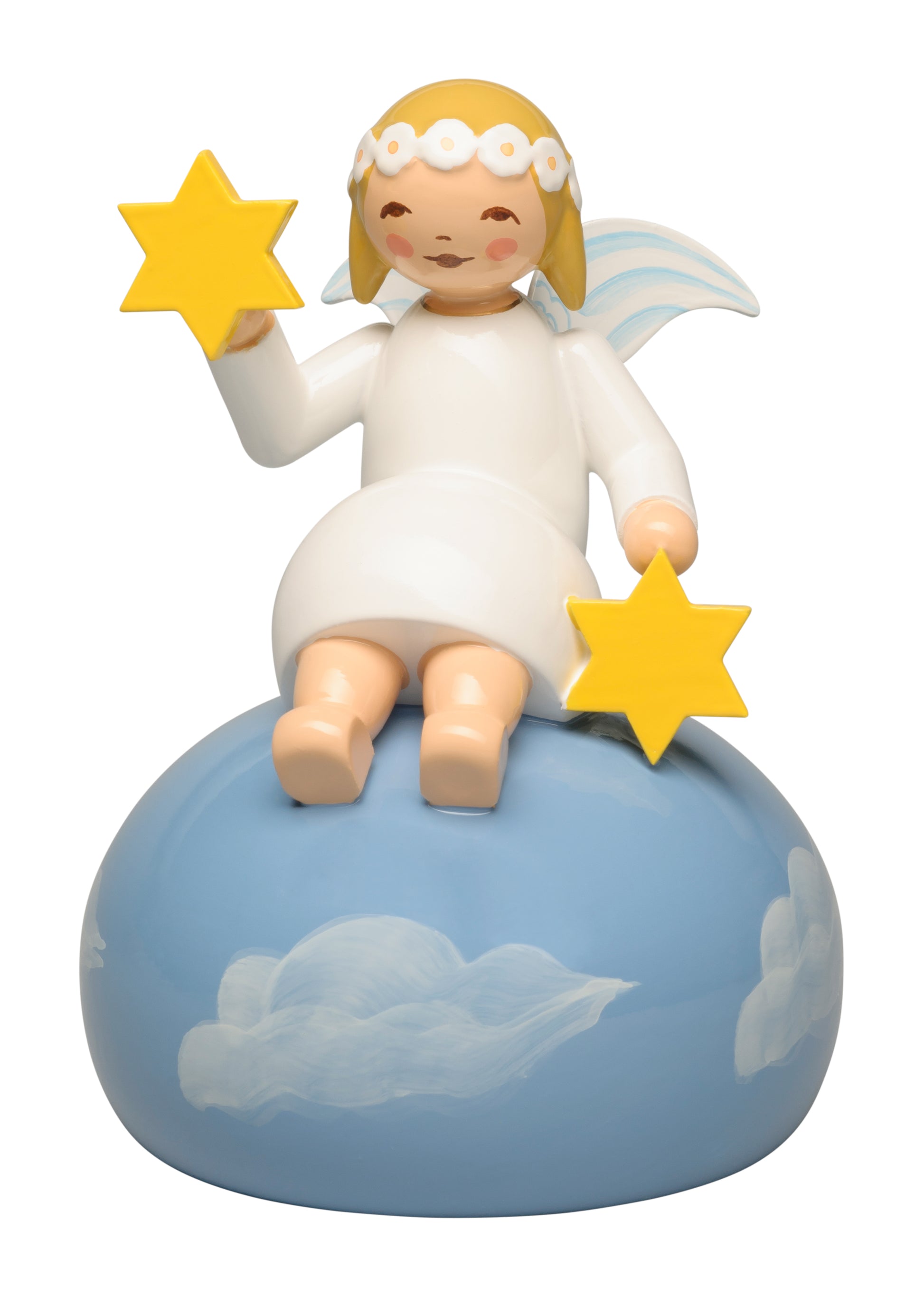 Der liebliche Engel mit Margeritenkranz hat sich soeben auf einer Wolke niedergelassen und hält zwei sterne in seinen Händen. Der Engel auf Wolken wurde bereits am 2. Februar 1925 von Olly Wendt entworfen und wird nun zum 100 Jährigen Jubiläum der Margeritenengel erneut ins Sortiment gebracht und ausschließlich in 2025 hergestellt.