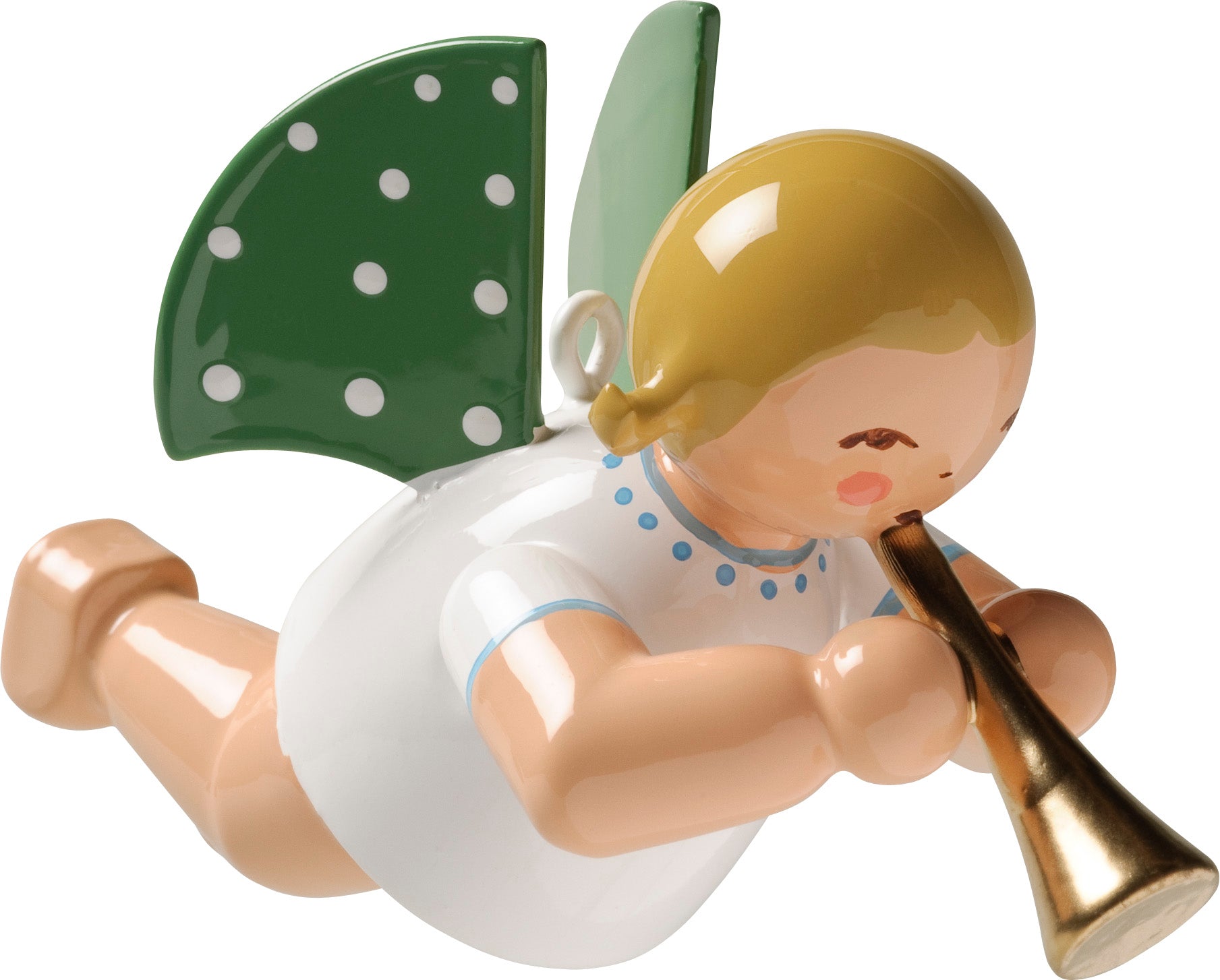 Der schwebende Elfpunkte-Engel, mit den grünen Flügeln hält eine goldene Flöte in seinen Händen. Der zum Aufhängen geeignete Musikantenengel ist eine herrliche Dekoration für die Festtage.