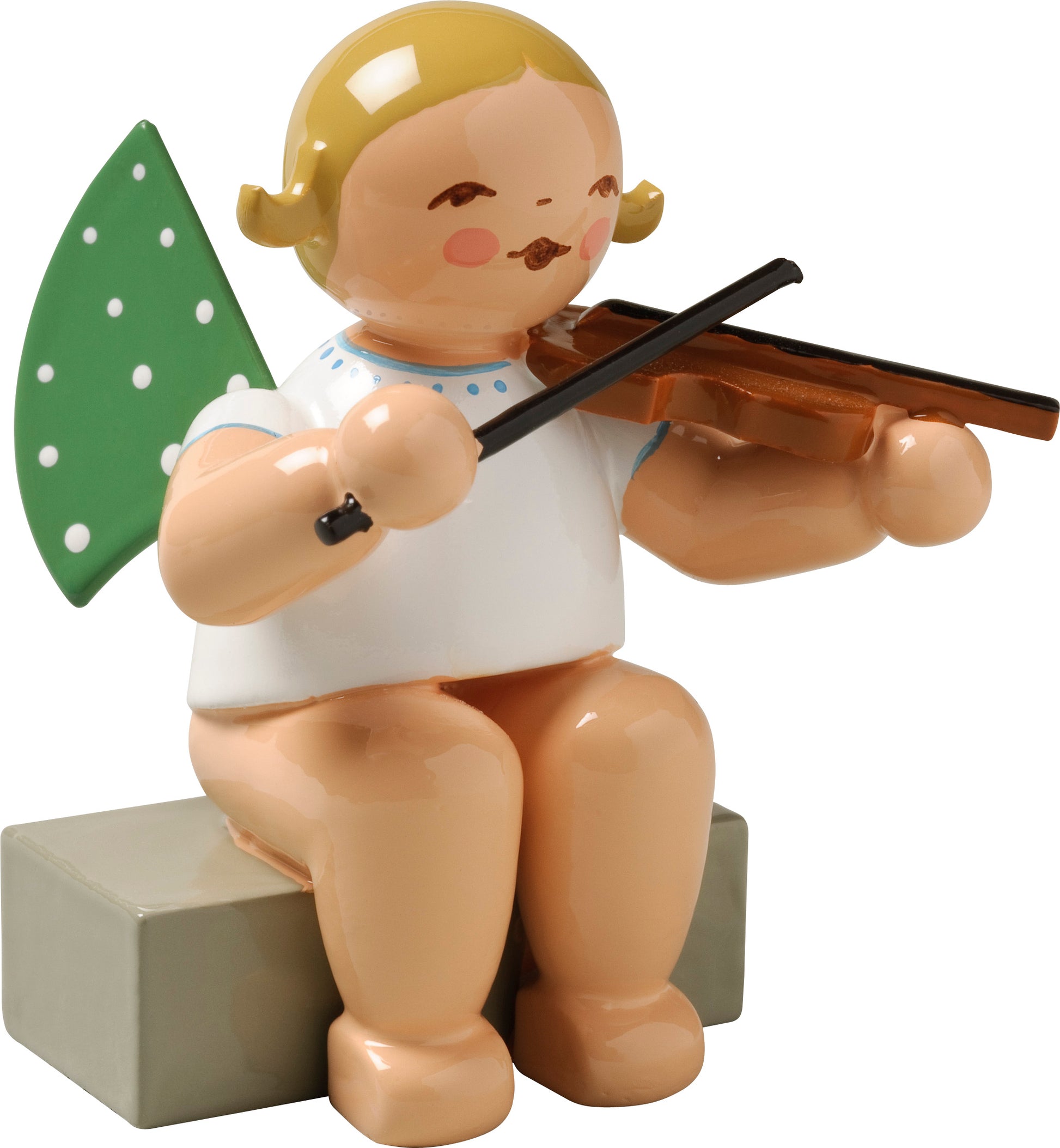 Der Klassiker bei dem Orchester ist der Engel mit Geige, der auf einer kleinen Bank sitzt. Der fidele Musikantenengel, der voller Begeisterung den Bogen streicht, ist 5 cm hoch.