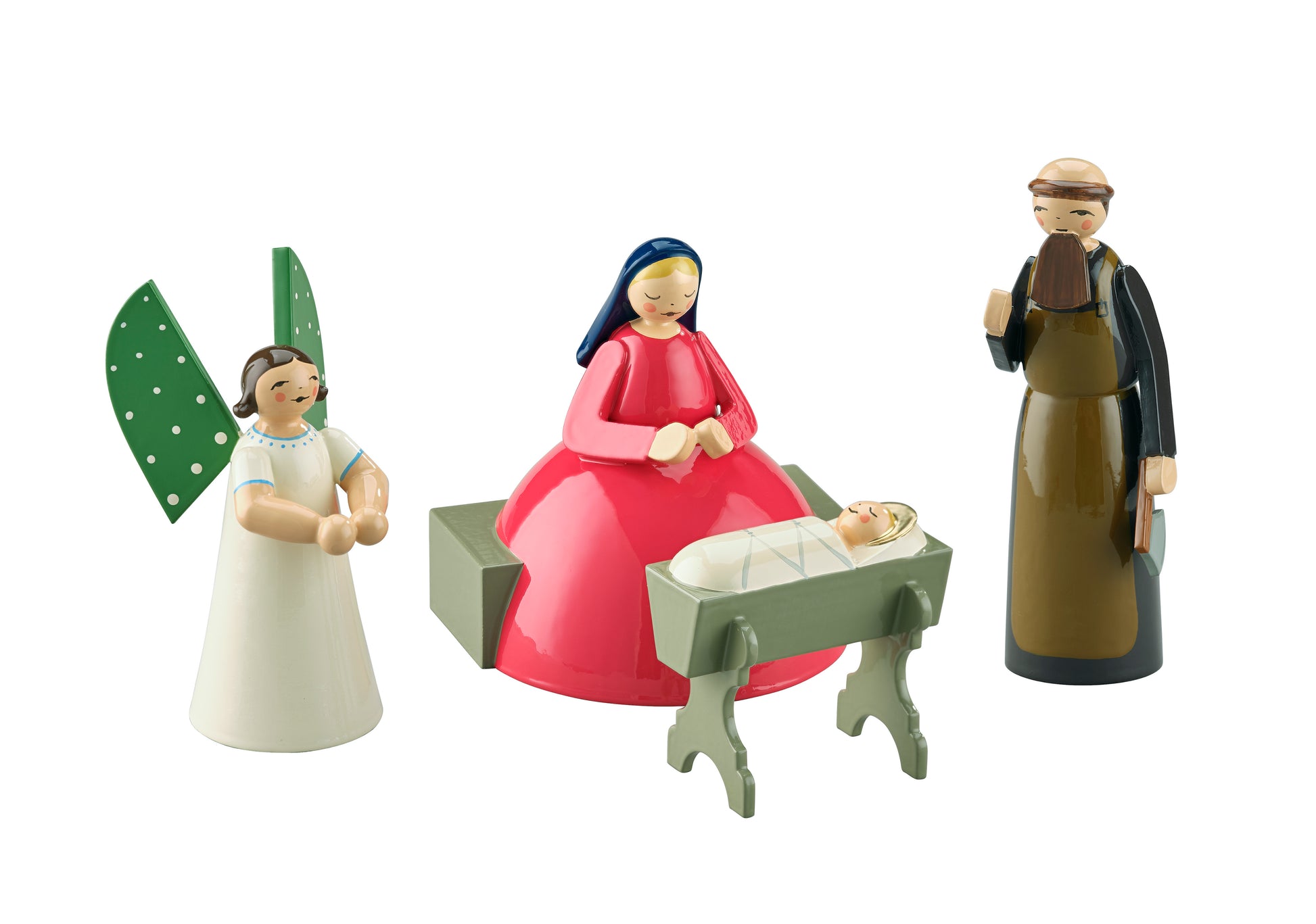 Die liebevoll gestaltete Krippenszene aus dem Hause Wendt & Kühn bringt die Weihnachtsgeschichte auf besonders stilvolle Weise in Ihr Zuhause. Das Set besteht aus vier harmonisch aufeinander abgestimmten Figuren: Maria (Höhe 6 cm), Josef (Höhe 7,5 cm), die Krippe mit dem Christkind (Höhe 3,5 cm) sowie ein anmutiger Krippenengel (Höhe 6 cm).
